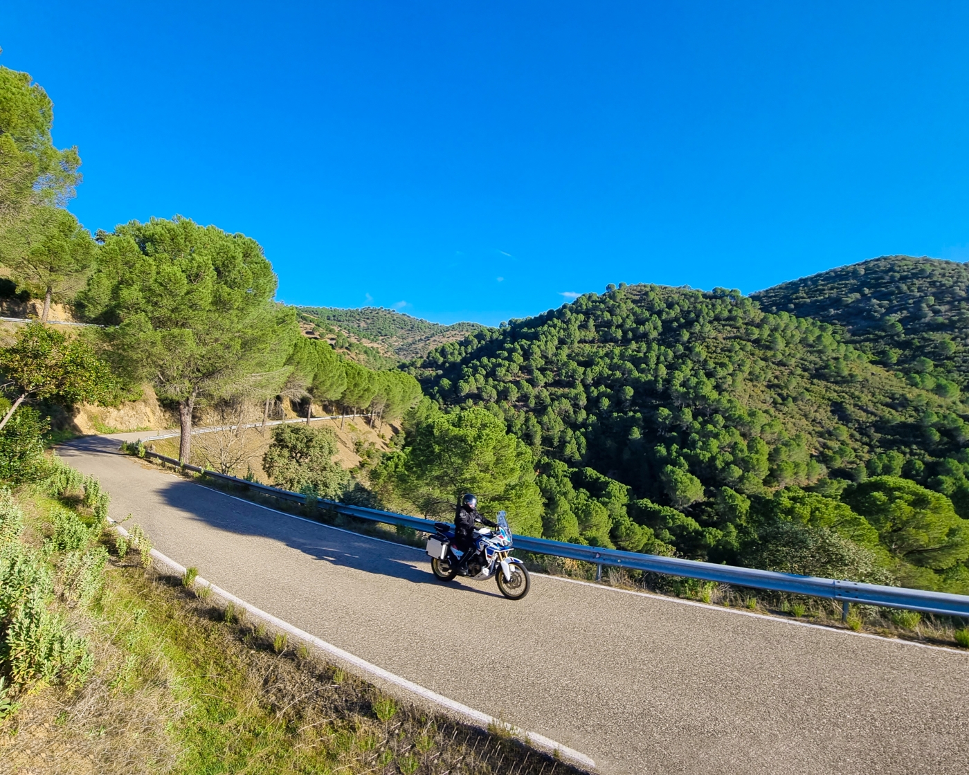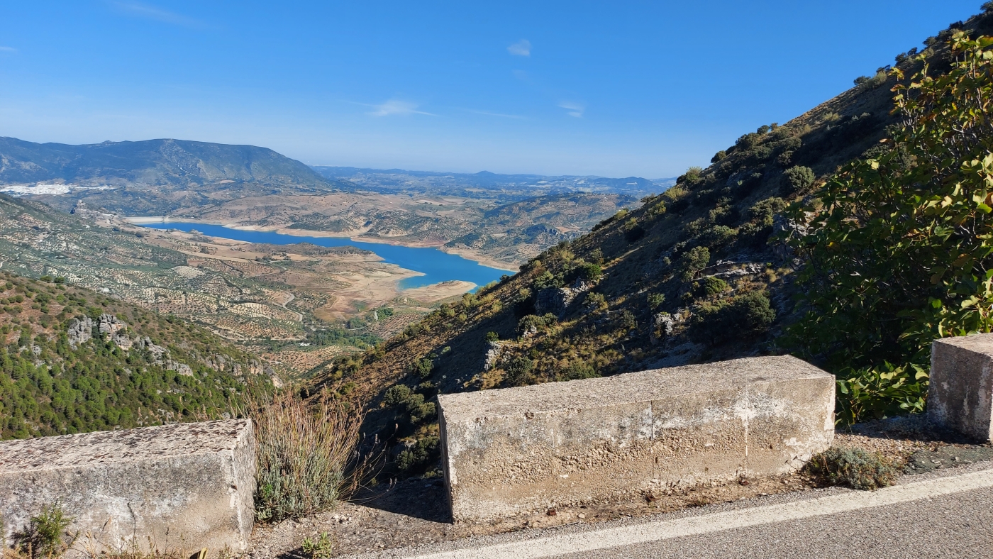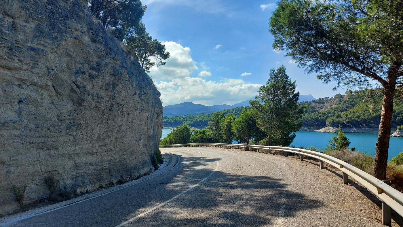 Via vlotte wegen laat je Granada achter je, en vanuit het vlakke landschap rijd je de bergen in. Het uitzicht vanaf de weg omhoog is fenomenaal en vooral goed te zien vanuit één van de Miradors. Na een van de bochtige wegen door de bergen rijd je "tegen" het mooie dorpje Montefrio aan. Zo ga je de dorpen vaker zien tijdens deze reis. De Iglesia staat op het hoogste punt van het dorp en de huizen staan daar omheen tot in het dal. Allemaal wit. Na Montefrio gaat de route richting het Parque Natural Sierras Subbéticas. De korte route raakt het natuurpark. De lange en XL-route maken hier een extra lus doorheen. Het landschap is weids en verlaten, de wegen wisselen elkaar af van bochtig tot glooiend. Genietend vanaf de motor en veelal omringd door olijf- en amandelbomen. De intensiteit van deze bomen neemt toe naarmate je Córdoba nadert. Zover als je kunt kijken olijfbomen. Soms gemarkeerd door een rijtje palmbomen. Dan op eens is daar de grote en oude stad Córdoba.